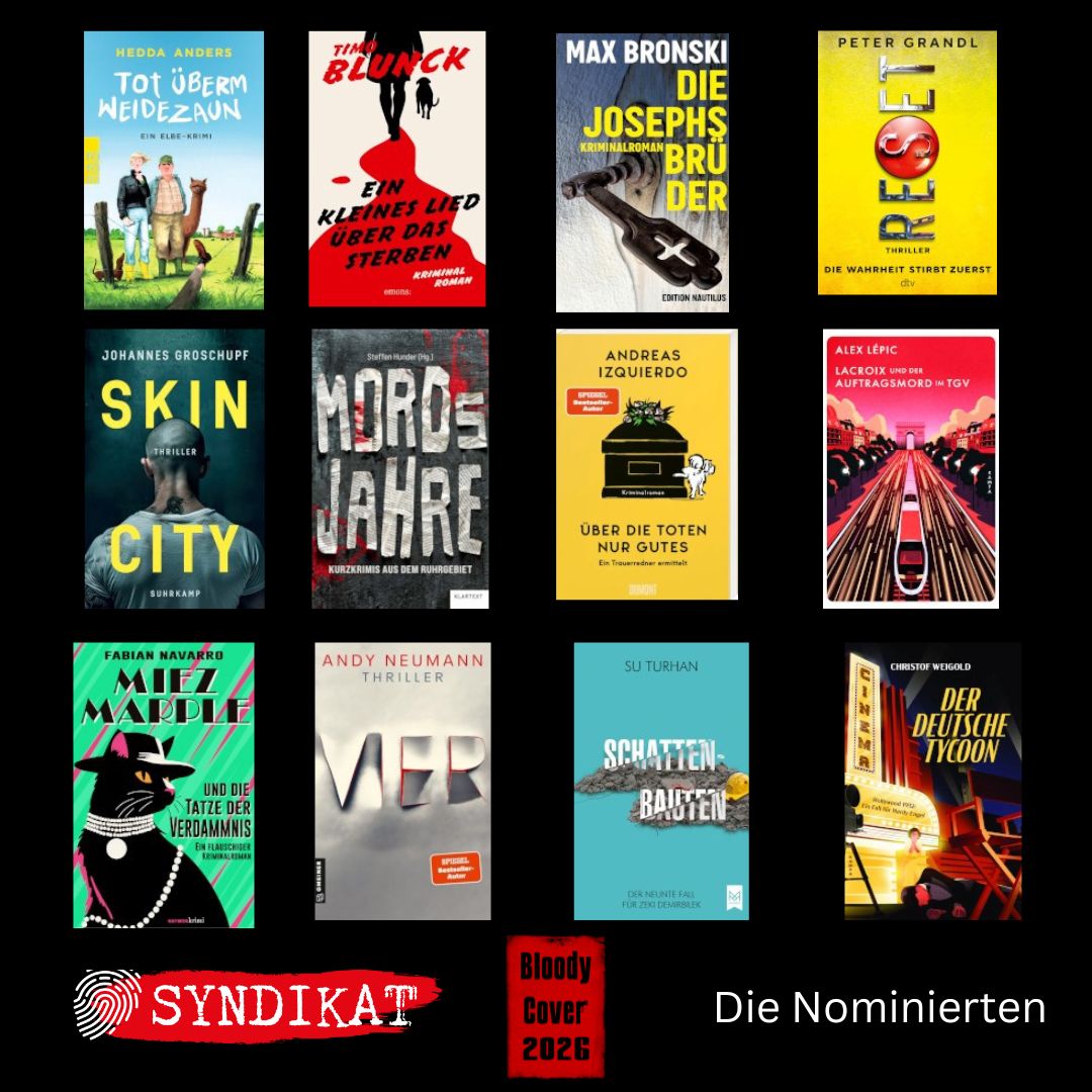 12 Finalisten, die aus rund 400 Krimi-Neuerscheinungen des Jahres 2025 ausgewählt wurden, konkurrieren um den Titel des originellsten, stimmigsten, markantesten – kurzum: des besten Covers eines deutschsprachigen Krimis.